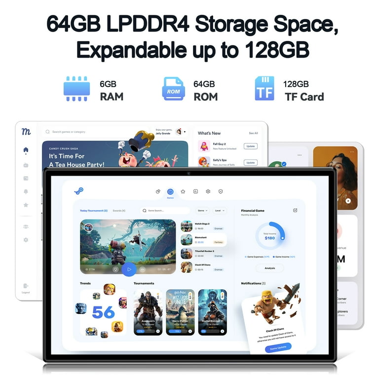 The Android 13 tablet has built-in super memory, which can expand your storage to 128GB with a Micro SD card. More space to record your life and store your photos, video or games.