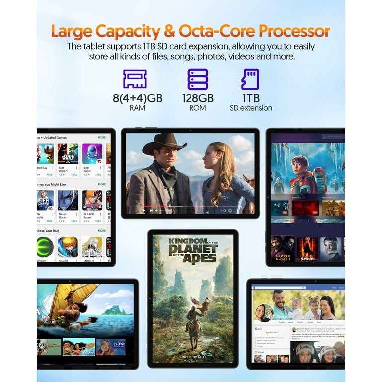 • 【8GB+128GB Storage Tablet】 The android tablet with 8(4+4) GB RAM 128GB ROM(1 TB expandable). large storage space for your daily entertainment and work needs. For example, keep games, videos, songs, eBooks, photos and important files. With the updated Android 14, you can enjoy a user-friendly experience.