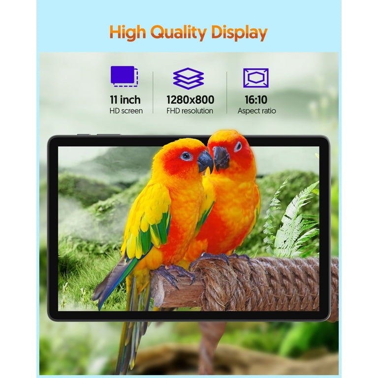• 【11 inch HD Tablet】 11 inch large clear screen, 1280x800 resolution, you can enjoy vivid visual effects when watching movies. User friendly interface, no bloatware, no unexpected ads, connect to WiFi and the tablet can be used directly. Perfect for home, office and school use.