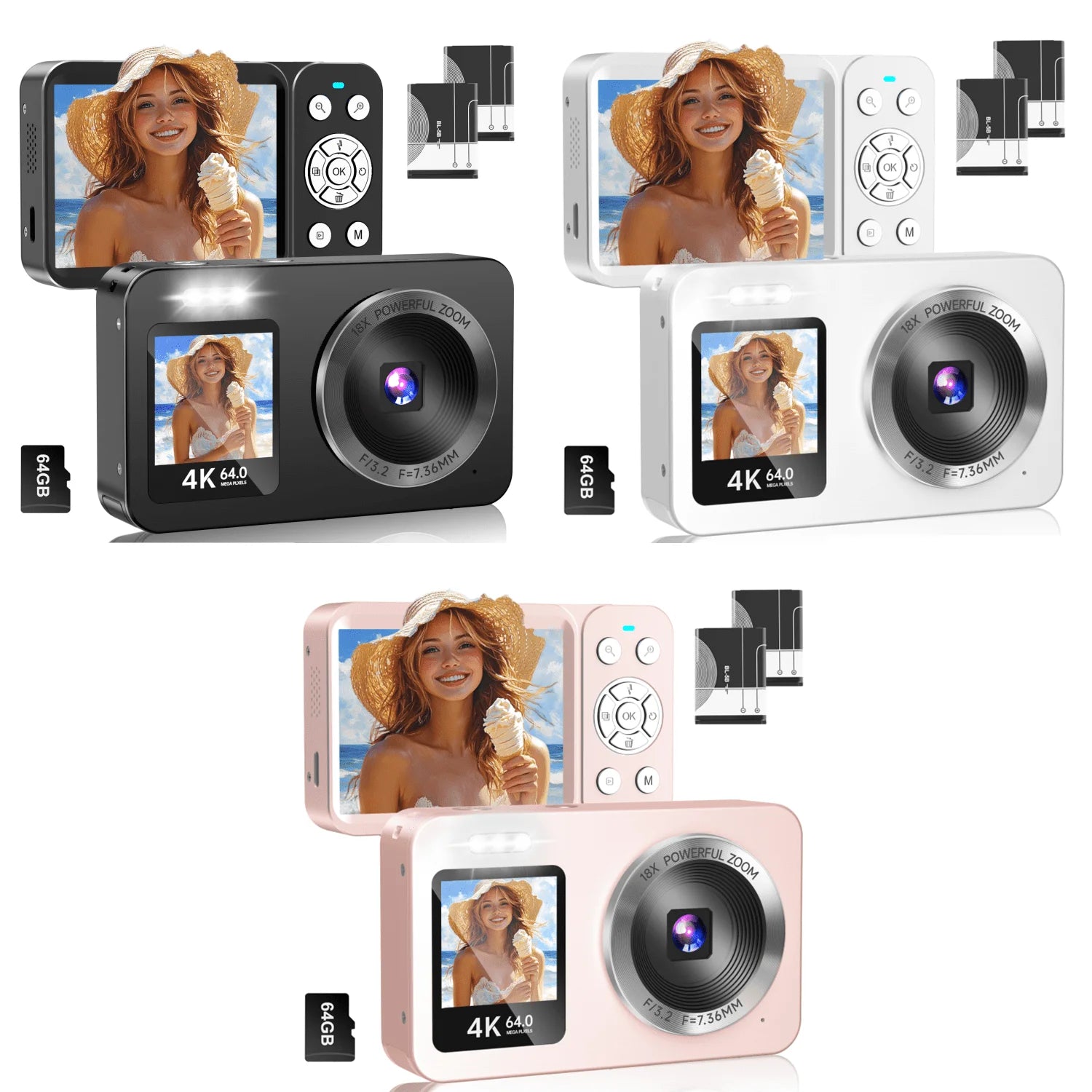 4K Digital Camera 64MP,Froura Dual-Screen Vlogging Camera,18X Zoom,64GB Card,2 Batteries,Point and Shoot Camera for Kids,Teens ,Beginners,Boys ,Girls,Compact Travel Camera,Birthday Gifts,Pink