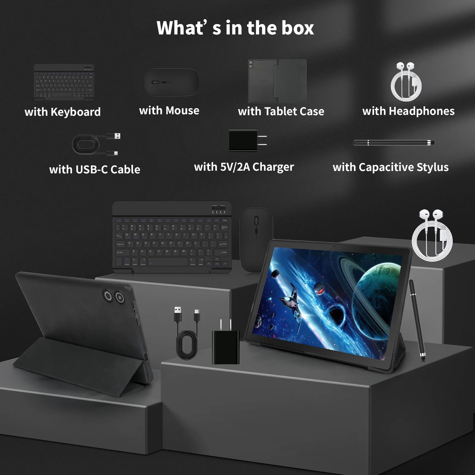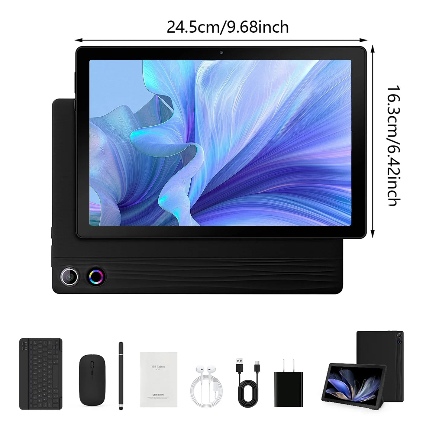 Technical details: Allwinner processor, Bluetooth 5.3, 8MP rear webcam with AF & 7-color lights, 5MP front webcam, Android 14, 64GB memory, 4-hour battery life, 10.2Wh lithium battery (0.84g, 1 cell), 1 protective case. CPU: A523 octa-core ARM Cortex-A55 (up to 1.8GHz) + single RISC-V CPU (up to 200MHz). Box includes tablet, charger, keyboard-mouse set.