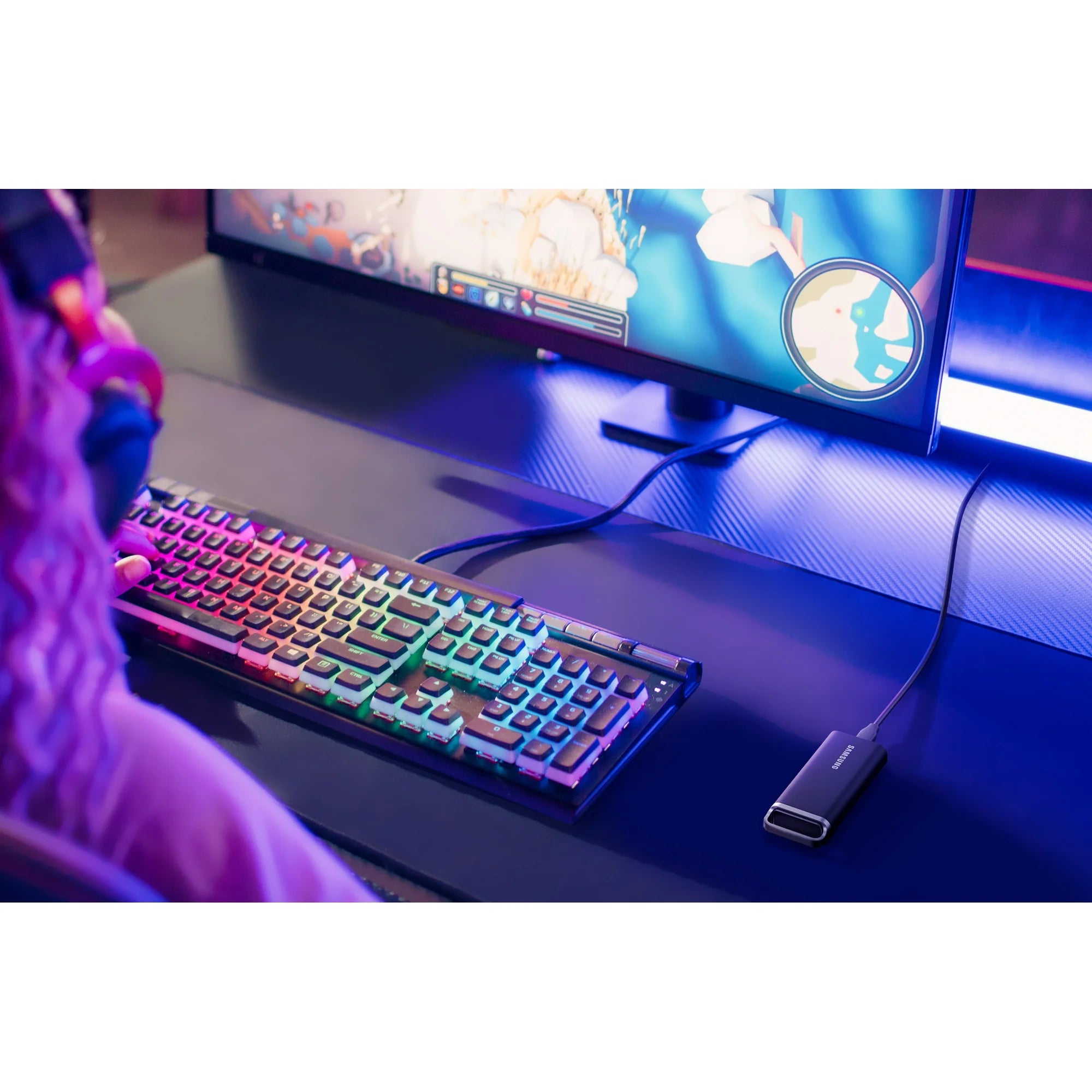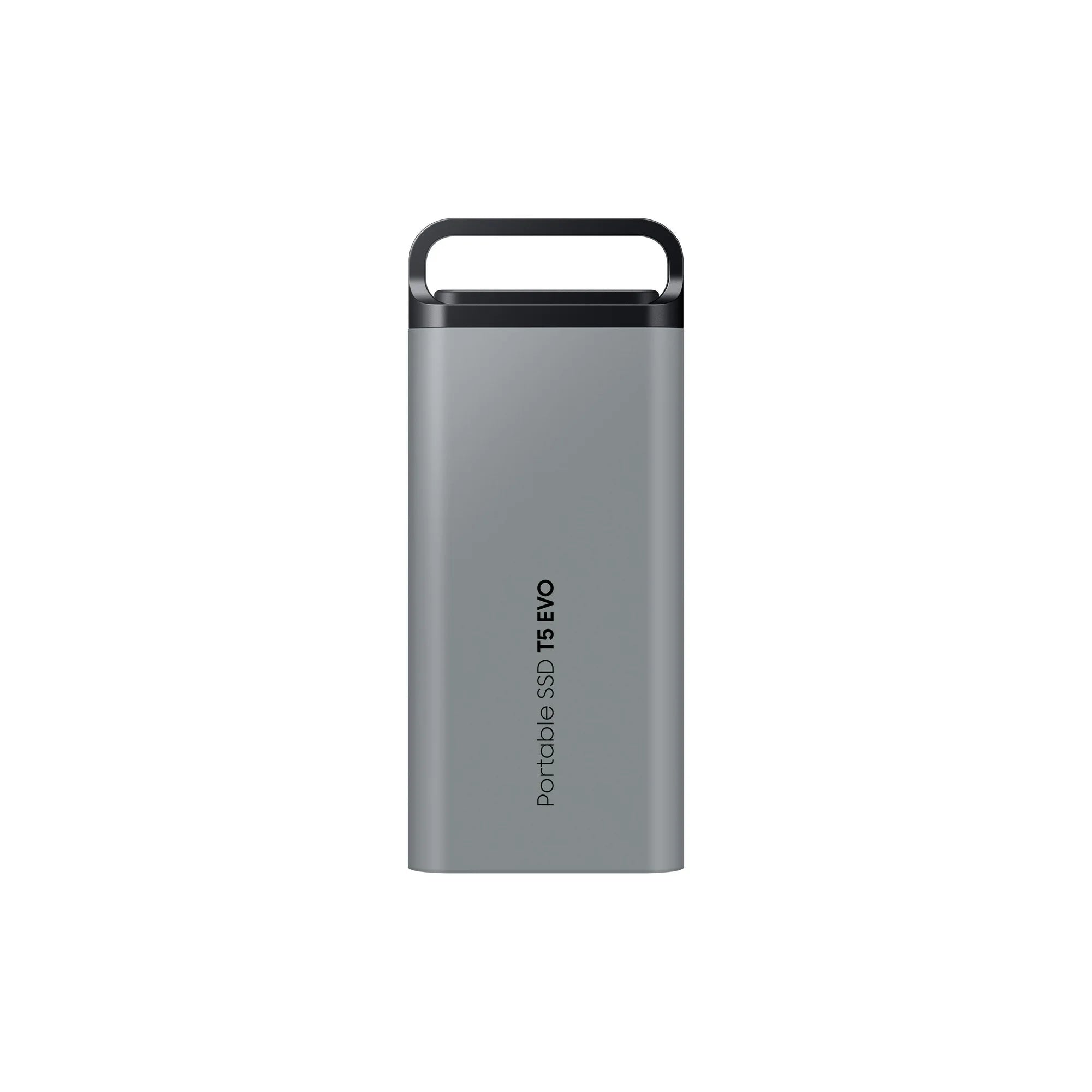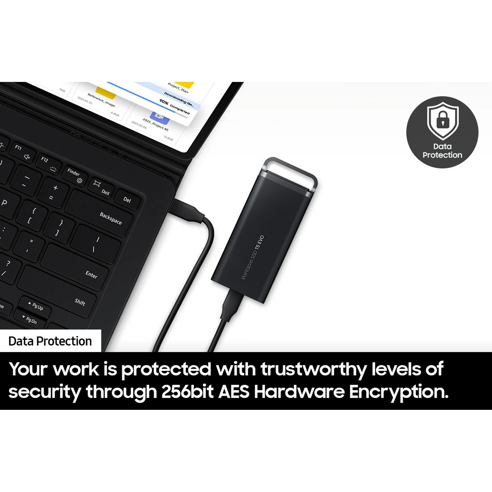 We went big and made it portable. It’s the SAMSUNG T5 EVO Portable SSD 2TB—an ideal choice for gamers and content creators. This SSD is engineered to handle large file transfers while still small and nimble enough to take along on all your adventures. It’s light enough to take it anywhere. Even with its compact size, it still comes with a storage capacity of 2TB, making it an easy way to store more on-the-go. Forget old, external Hard Disk Drives. The T5 EVO is optimized for large file transfers with improved Intelligent TurboWrite and speeds your hard drive will be jealous of. It’s also supported by USB 3.2 Gen 1 for superb performance and device compatibility. Set your sights high. This strong, sturdy sidekick will help you see it through with shock resistance and fall protection up to 6 feet.* With its solid aluminum unibody construction and rubber skin, it’s made to withstand any adventure. It can also be secured with an AES 256-bit encrypted password for extra protection. Whether you’re using a desktop, camera or a gaming console*, count on the T5 EVO Portable SSD for extensive compatibility. It's a true team player when it comes to heavy-duty application usage or file-saving for full flexibility. Get your stuff done. Save it safely. Your work is protected with trustworthy levels of security through 256bit AES Hardware Encryption. It provides complex password protection, helping to safeguard access to your content. *Based on a free fall shock test conducted under controlled conditions. **Host device compatibility may vary.