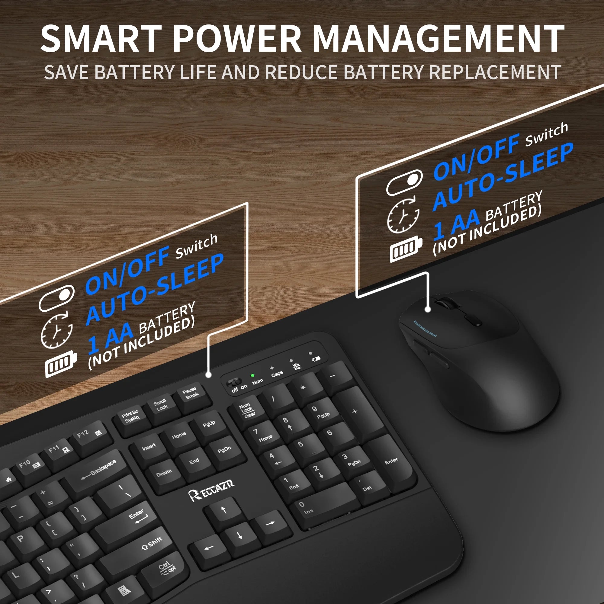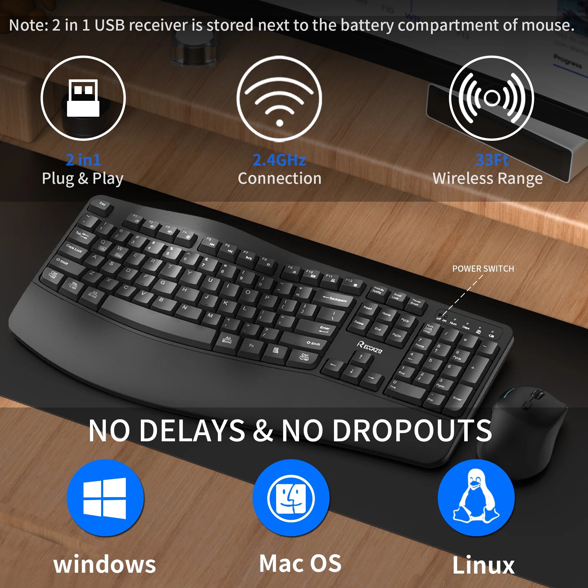• 【2.4Ghz Wireless Connection】Stable and reliable connection of wireless keyboard and mouse is up to 10m(33ft). This combo share a nano USB receiver, no need to take up additional USB ports (Also the wireless keyboard and mouse can also be used separately). Plug and play, no software needed,convenient and efficient.