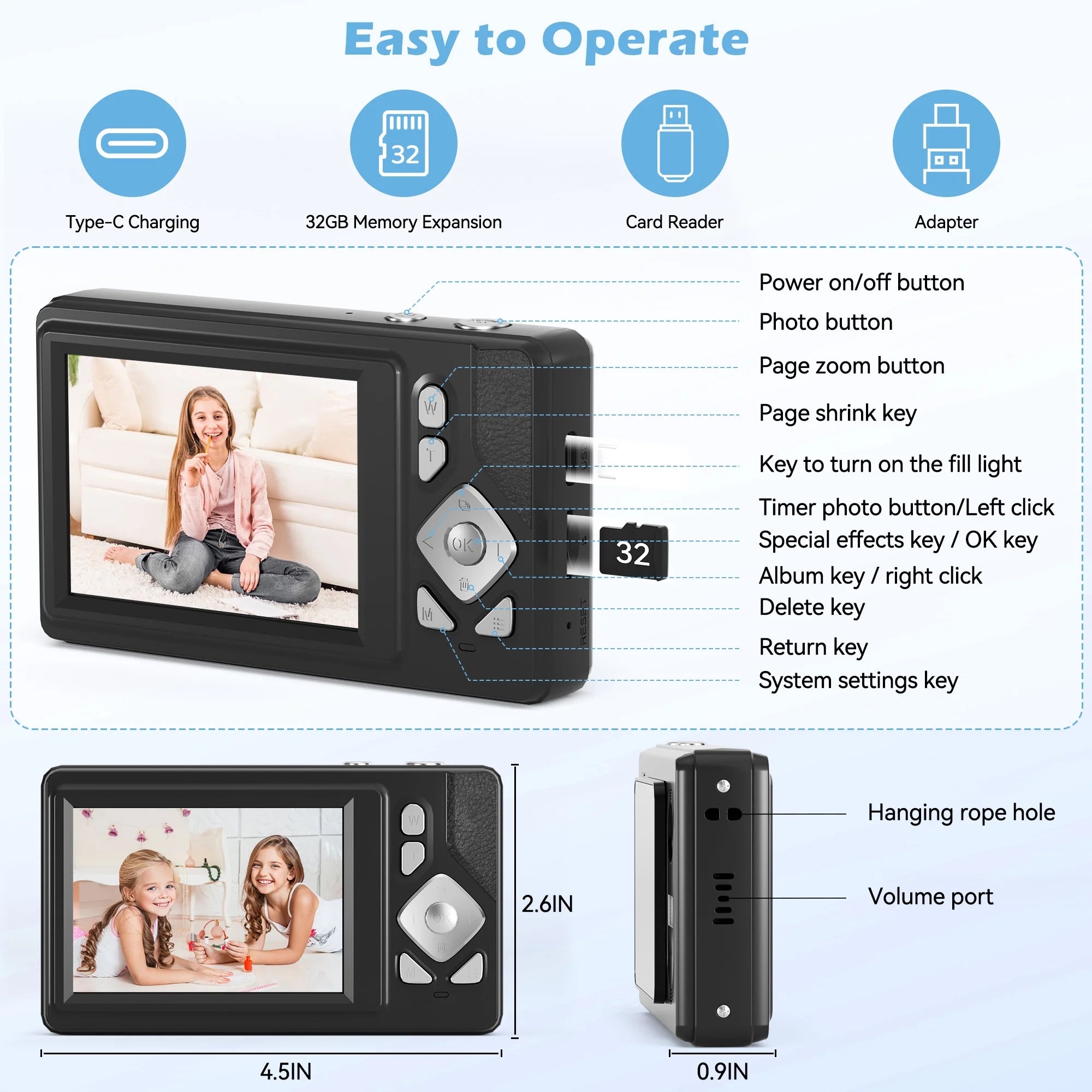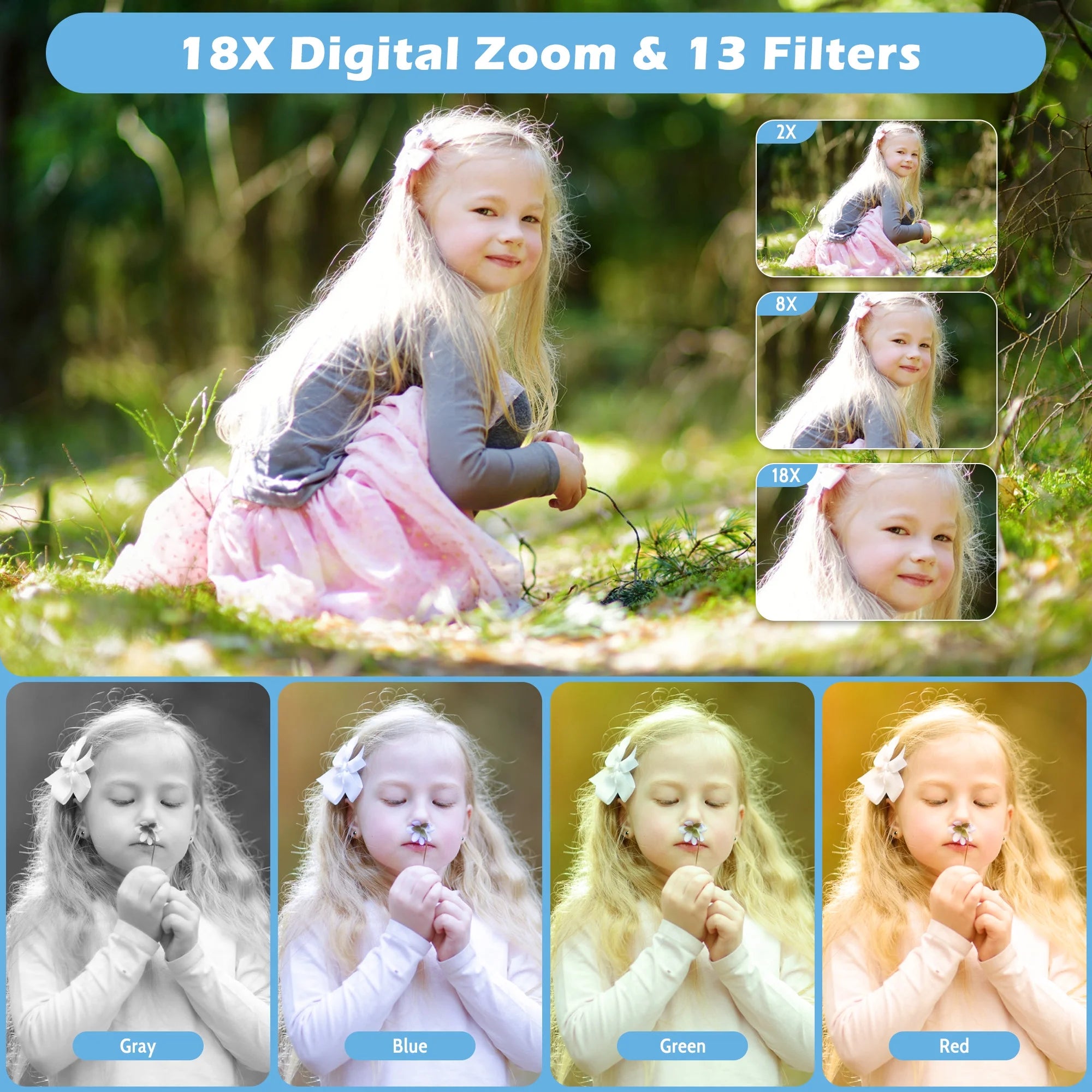 🔍【18X Digital Zoom & Smart Autofocus】:Equipped with 18x digital zoom, the camera allows flexible zoom adjustment using the W/T button, making it easy to capture distant scenes. With auto-focus functionality, it offers fast and accurate focusing. Simple to operate, even kids can easily get started and snap clear, high-quality shots effortlessly!